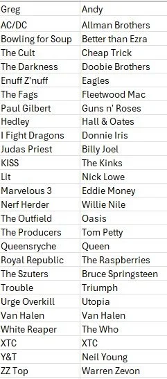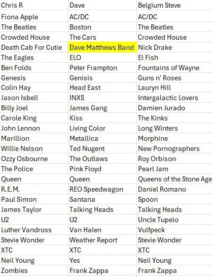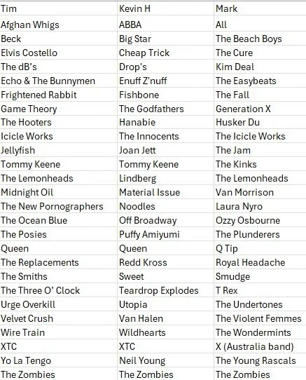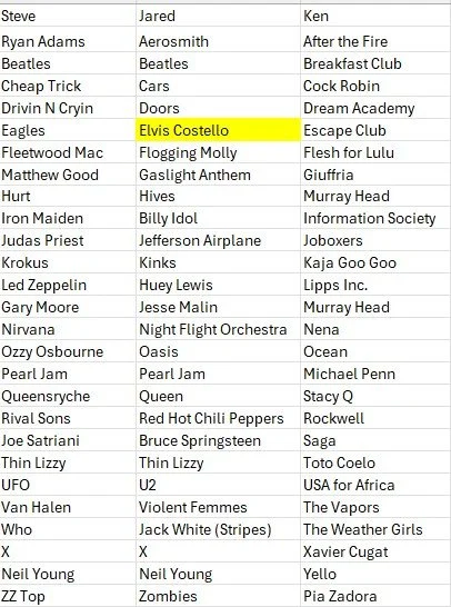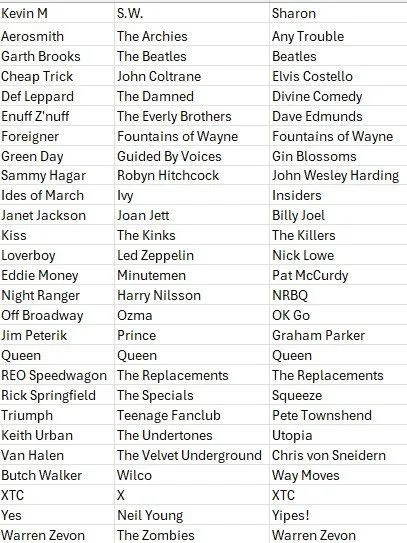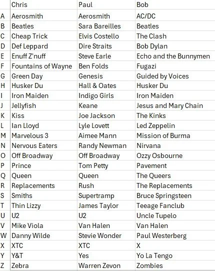 Consider coming up with your own choices before perusing the lists below. Please ignore misspelling, and please don’t shoot the messenger when it comes to entries that should have been disqualified (Elvis Costello as an E entry, for example); Chris and I didn’t catch some of these as they came pouring in toward the end of our podcast challenge. Also, consider checking out author S.W. Lauden’s Substack where he addresses the same music challenge. And yes, I am aware than Ken was messing with us when he chose acts like USA for Africa and Pia Zadora. All good!